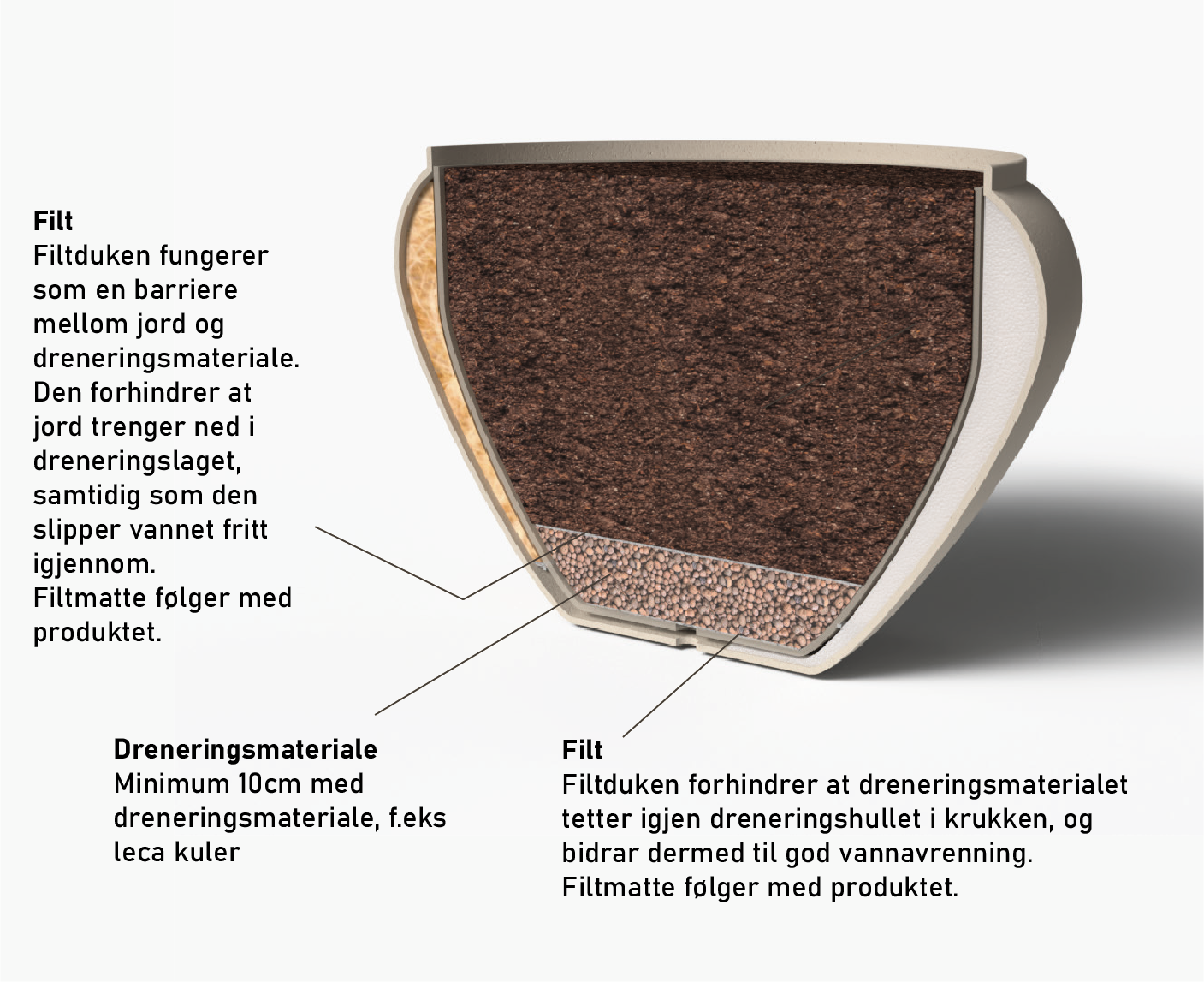 For å sikre god drenering og lang levetid for krukken, anbefales det å legge et lag på ca. 10 cm med egnet dreneringsmateriale, for eksempel lecakuler. Over og under dette legges en filtduk for å hindre at jorden blander seg med dreneringslaget. Dette bidrar til et sunt rotsystem og beskytter krukken mot frostskader. Se illustrasjon for forslag til oppbygging. I områder med sterk vind kan det være hensiktsmessig å bruke singel i bunnen. Dette gir ekstra tyngde og stabilitet, og reduserer risikoen for at krukken velter.
